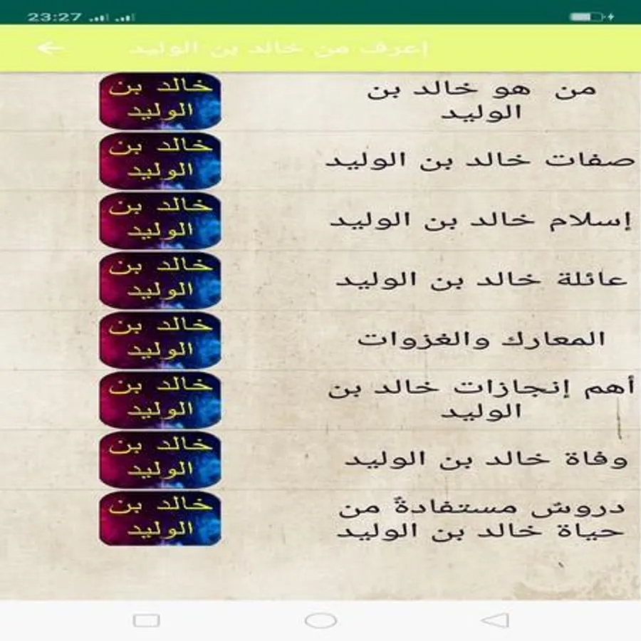 This application contains the biography of one of the greatest personalities in Islam and one of the greatest military leaders in history is the great companion Khaled bin Al-Walid - may God be pleased with him - the sword of God Almstul and his full name Abu Sulaiman Khalid bin Al-Walid bin Al-Mughaira, an Islamic figure who had a great impact in spreading the Islamic religion And the call to God Almighty as he gives a brief summary of the inflicted sword of God, Khaled Ibn Al-Walid. With his good military planning and ingenuity in leading the armies of Muslims in the wars of apostasy and conquest of Iraq and also his good character, and it was an active period in the era of my successors, the Prophet Abu Bakr Al-Siddiq and Omar Bin Al-Khattab Khalid Bin Al-Waleed was famous for his decisive victories in the battles of Al-Yamamah, Alice, Al-Farda, Al-Walajah and Yarmouk before his conversion to Islam, Khalid bin Al-Walid played a role Important in the victory of Quraish over the Muslim forces in the Battle of Uhud in the Battle of Trench. The application provides the story of Khalid bin Al-Waleed summarizing the recipes of Khaled bin Al-Walid and the most beautiful stories of Khaled bin Al-Walid, the form of Khalid bin Al-Walid and also his son Abdul-Rahman bin Khalid bin Al-Walid and Khalid bin Al-Walid to the Shiites