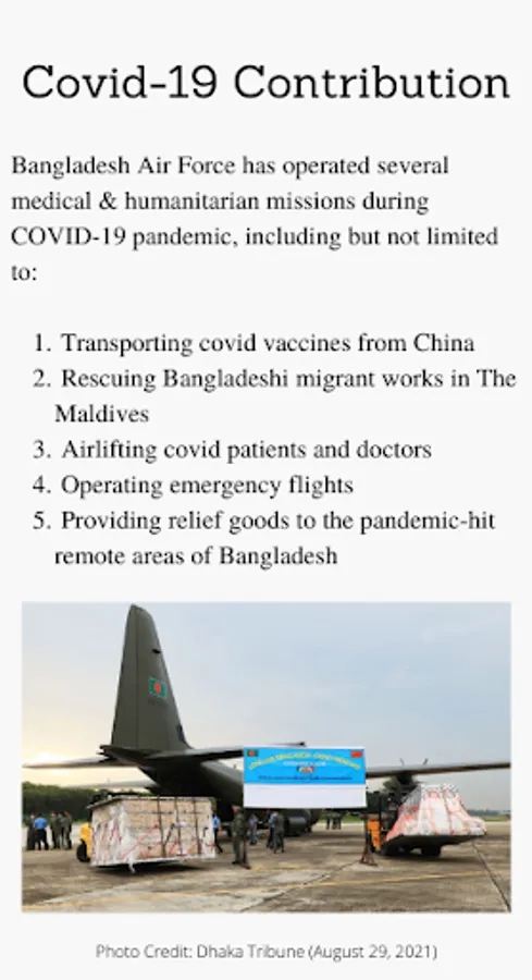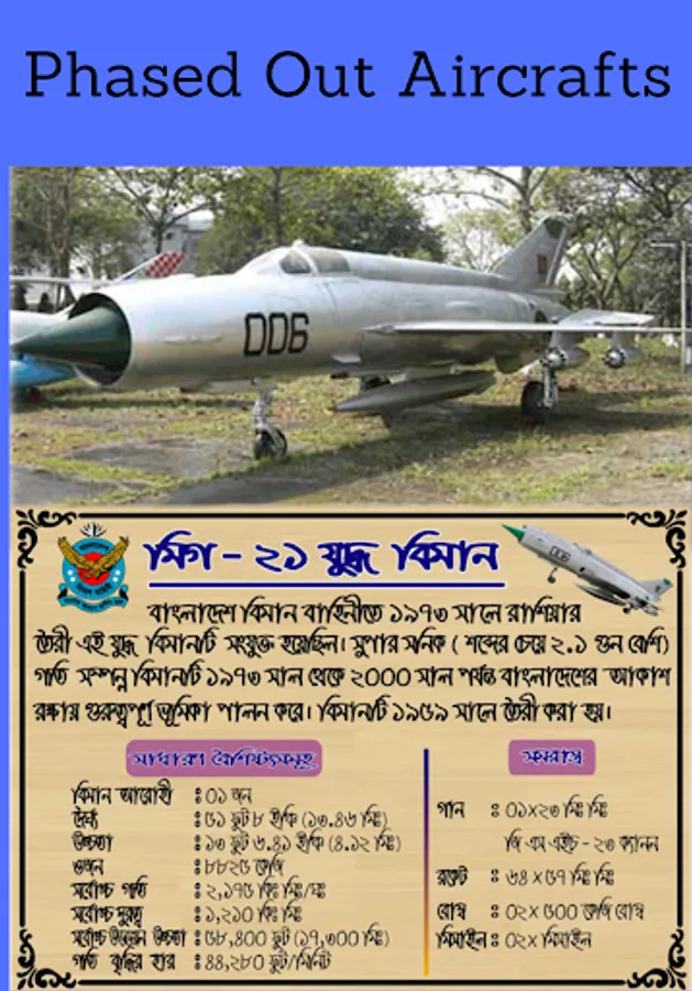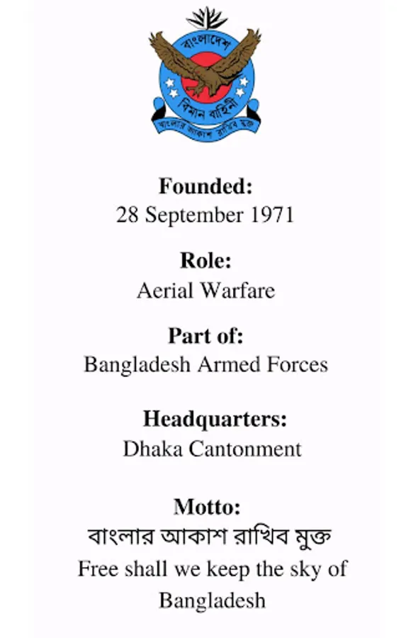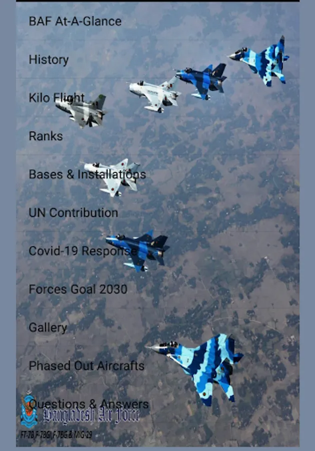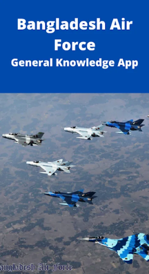 BAF General Knowledge app contains chapters on history, first flight, UN missions, ranks, bases, modernization program and gallery of Bangladesh Air Force.