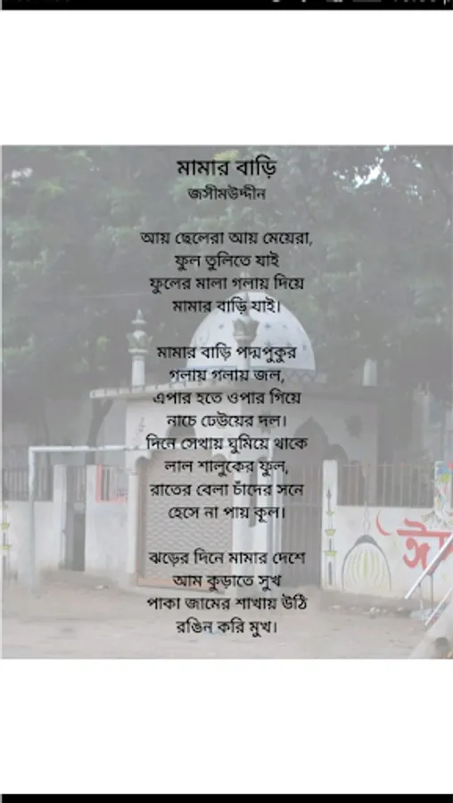 Poems written by Rabindranath Tagore (রবীন্দ্রনাথ ঠাকুর), Kazi Nazrul Islam (কাজী নজরুল ইসলাম), Jasimuddin (জসীম উদ্দীন) and other renowned poets can be found in Bangla Kobita App (বাংলা কবিতা অ্যাপ) .