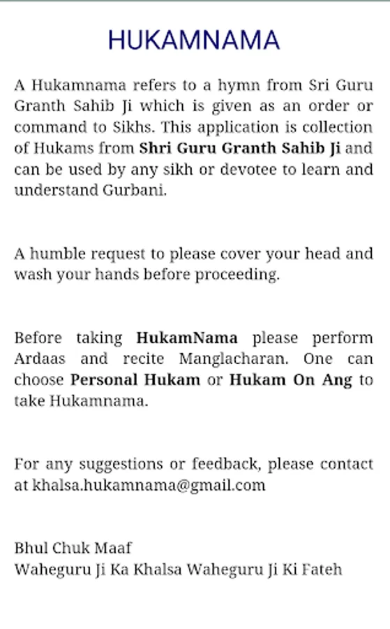 This application is a collection of Hukams from Sri Guru Granth Sahib Ji and aims to help in learning and understanding Gurbani. With this App, one can take a virtual personal Hukamnama or Hukam on a particular Ang (Page) and get Guru's guidance.