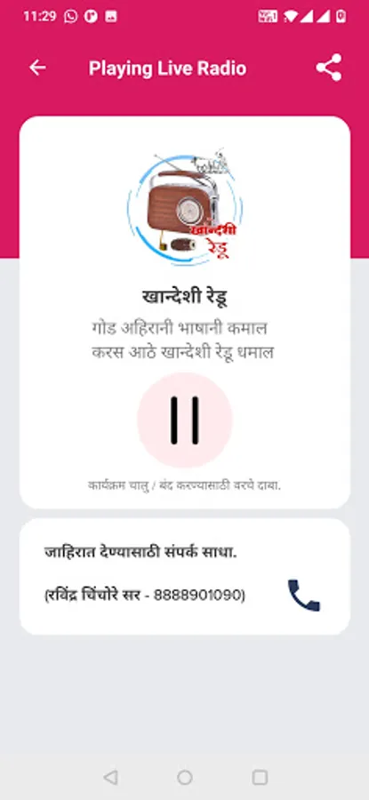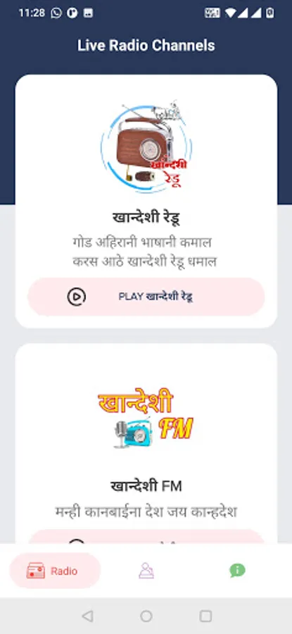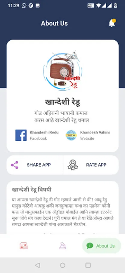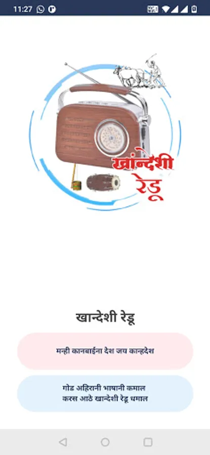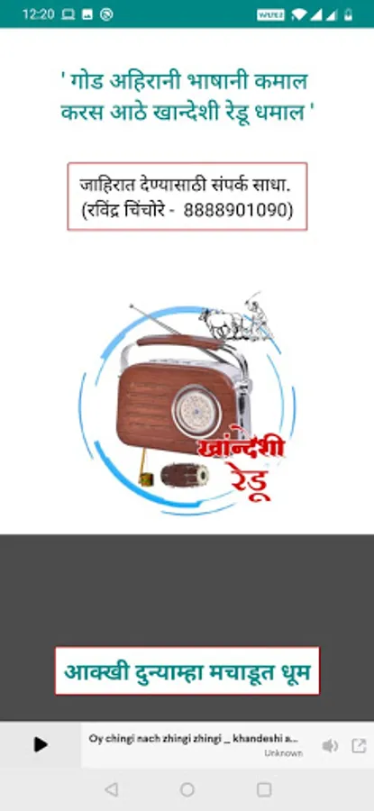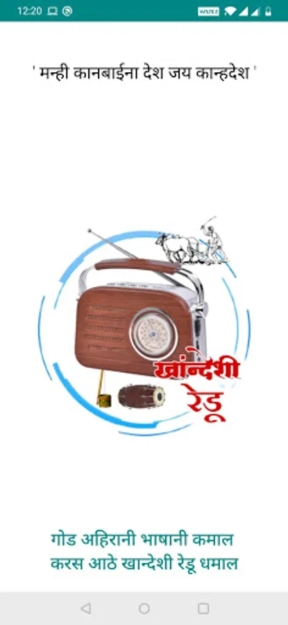 या आपला खान्देशी रेडू नी गोट म्हणजे आसी से की! आवू रेडु मानुस कोटेबी आयकू शकी जगदुन्याम्हा कथा का ऱ्हायेना कोनी फक्त तो मानुसफाईन एक अँड्रॉइड मोबाईल आनि त्याम्हा इंटरनेट सुरू जोये मंग काय देखनं! पुरी धमाल मंग ते या रेडिओम्हा आपले समदा आपला खान्देशी गांना आयकाले भेटथीन.