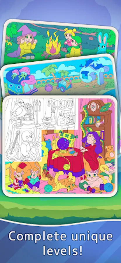 All paintings combine in short visual stories. Paint all pieces of the big picture and reveal it, add to your gallery and unlock another picture to paint.