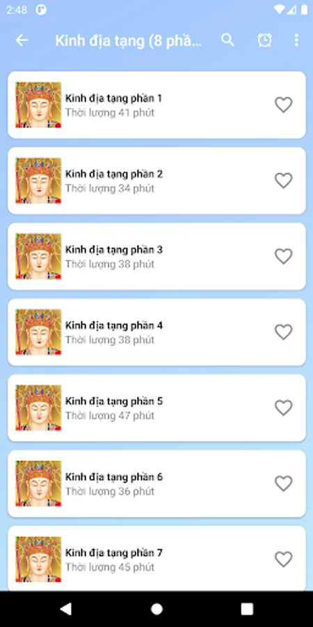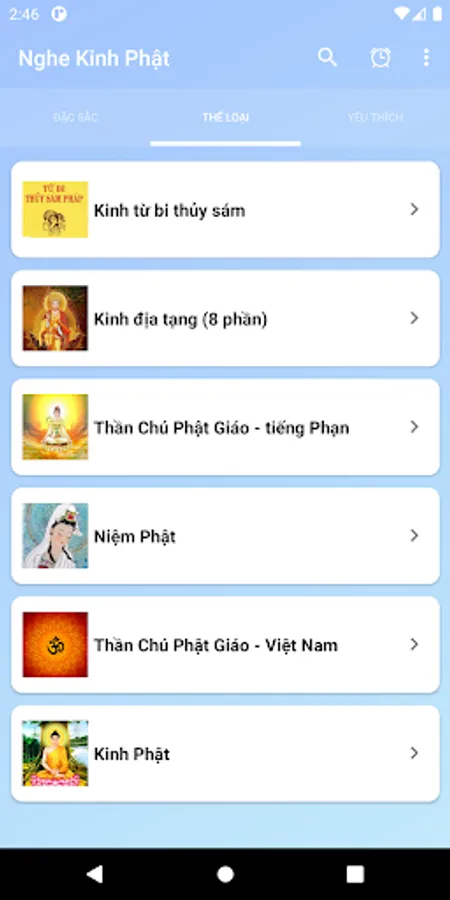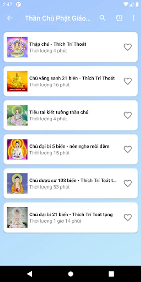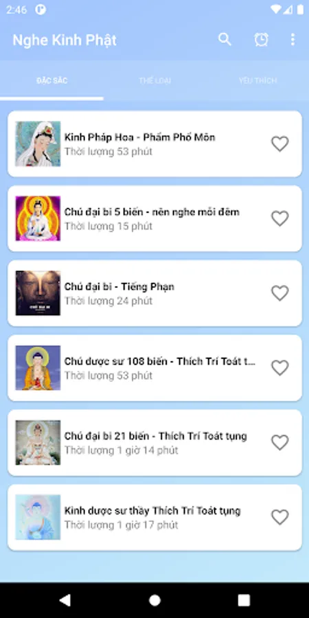 The application contains the most common suttas such as: the Amitabha Sutra, the Universal Gate Sutra, the Terrain Sutra, etc. along with mantras such as the great compassion mantra, the apothecary mantra, etc. recited by famous teachers such as Thich Tri Tot.