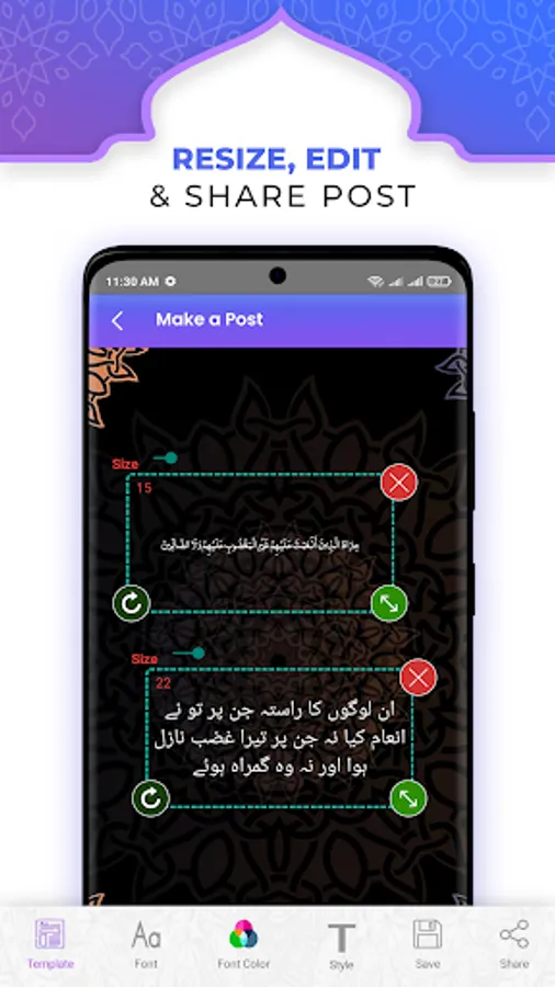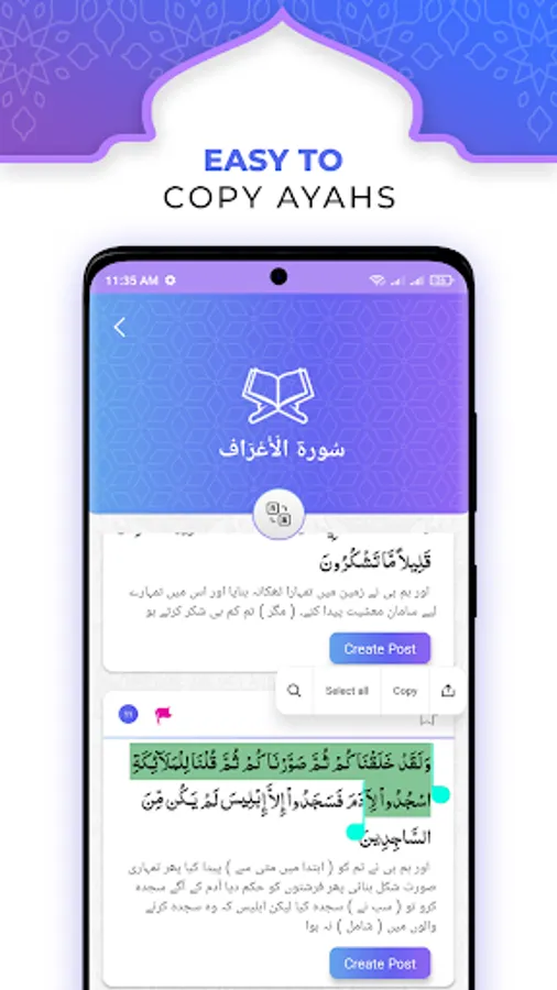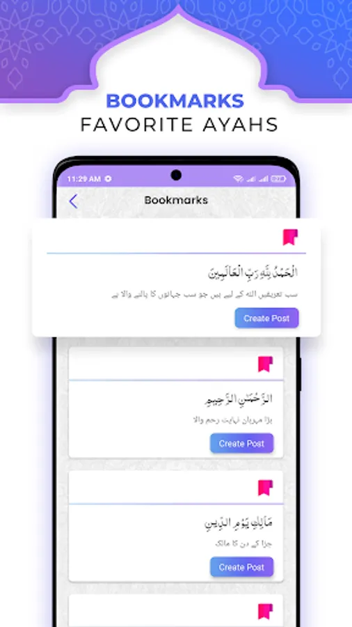 The Feature which make this Quran Kareem App different from other Islamic apps is Make & Share Quran Post.Save selected verses of Quran as image in your device. Convert desired verses in beautiful post with translations for sharing with others. You can also share Quran Verses via social media platforms.
