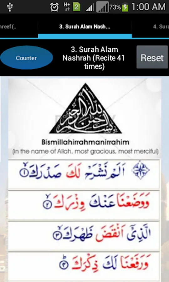 • Each screen has a Tasbi or Digital Tally Counter to to keep track of the count.