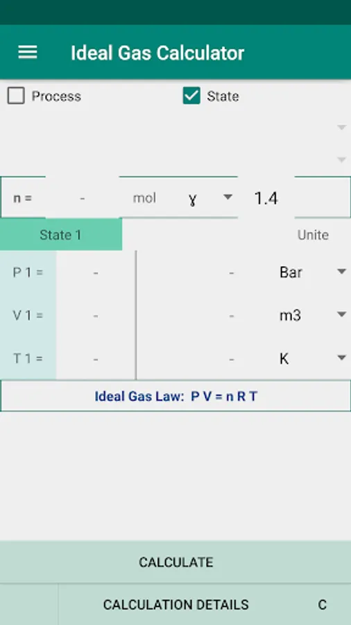 - Calculates state variables: absolute pressure (P), volume (V), and temperature (T) for ideal gas.
