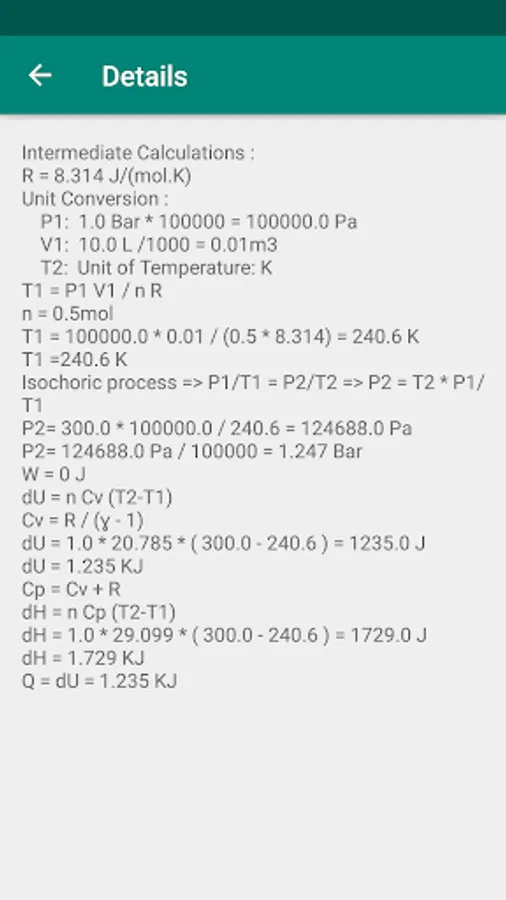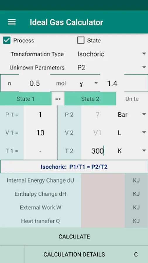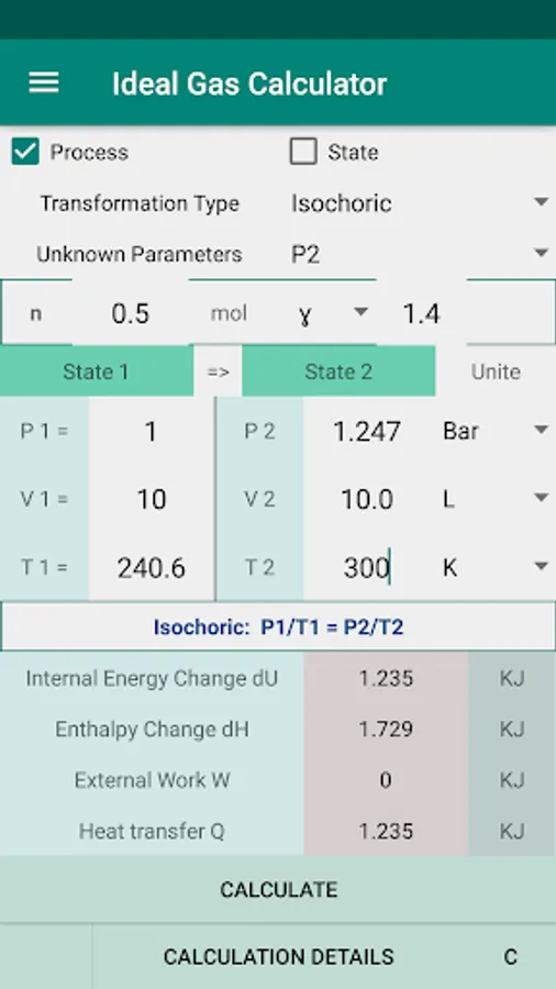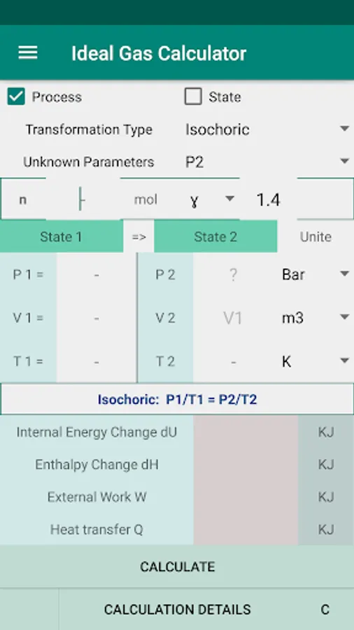- Calculates the changes in state variables in all type of gas processes : Isochoric, Isobaric, Isothermal, and Adiabatic.