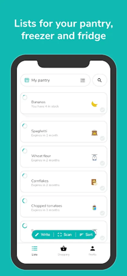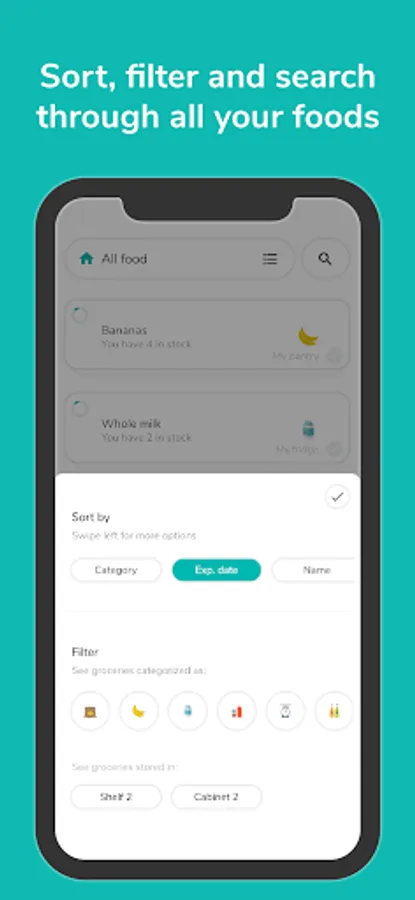 • Sort your food by expiration date, name or category
