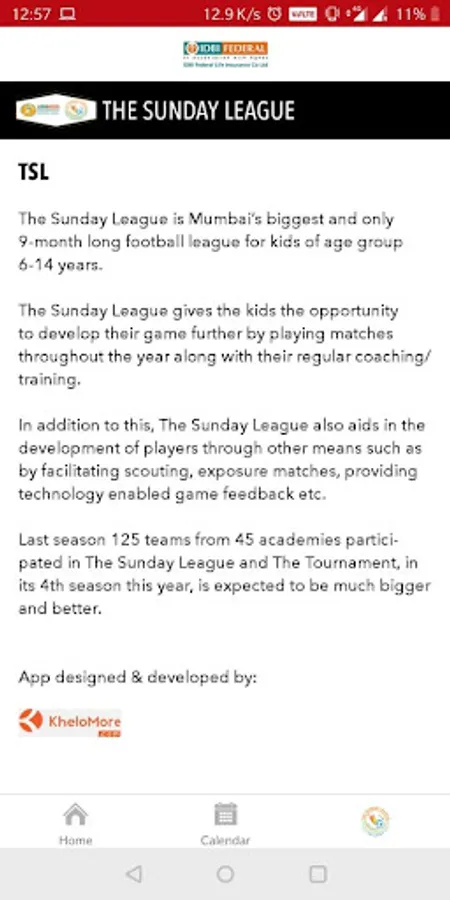 IDBI Federal - The Sunday League is the official app of The Sunday League tournament. Get instant access to all the tournament updates - fixtures, standing tables, results, news alerts, match analysis and much more. Watch all of our photos and videos exclusively on the app and stay updated with all the action from the pitch.
