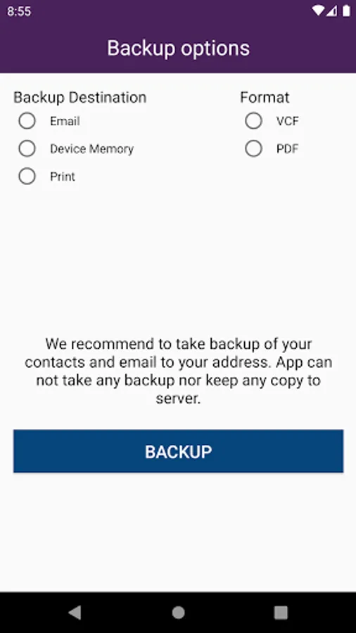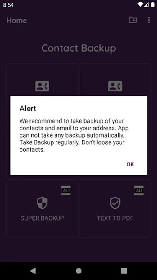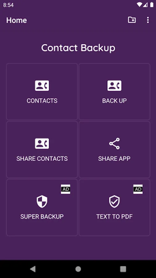 This application help you to take your contacts backup in cvf and pdf files. You can share these files with facebook , whats app email and much more. You can also create single or multiple contacts txt files. You can also remove ads by purchasing this application. or enjoy this application also free with ads.