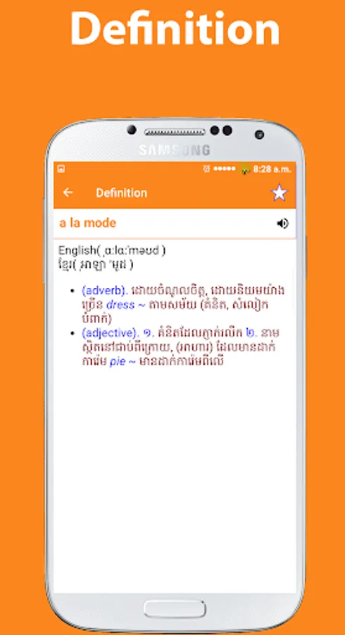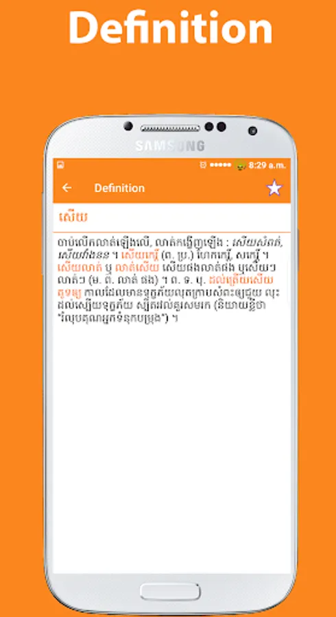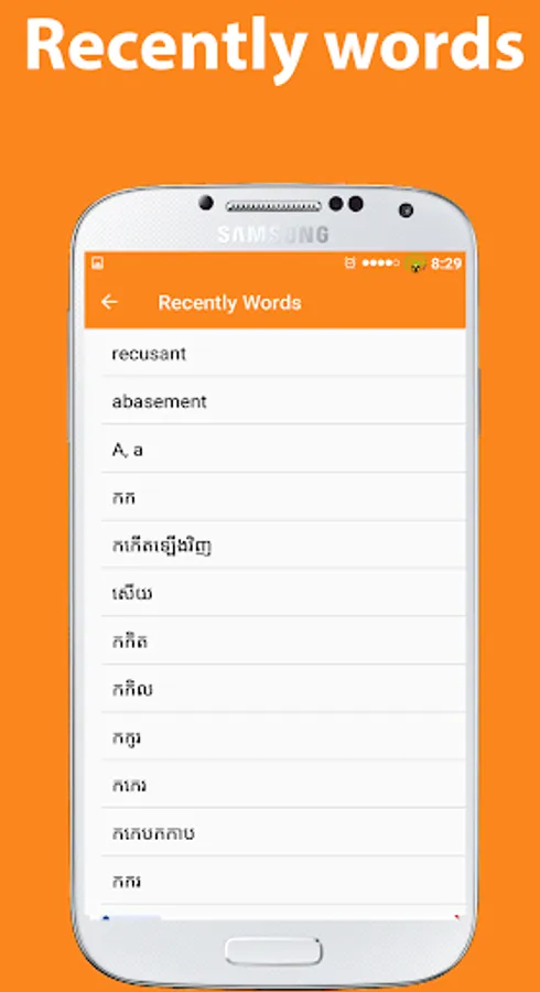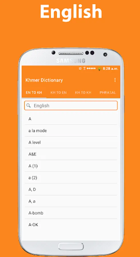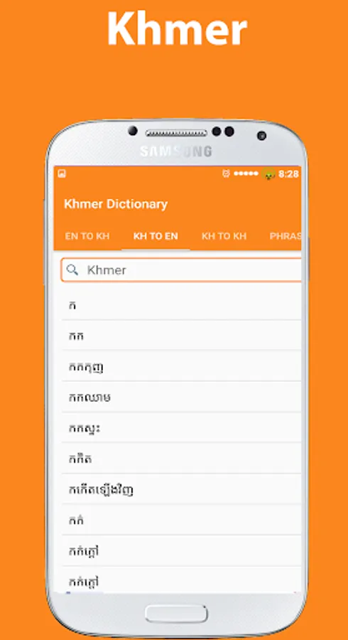 English-Khmer Dictionary is the latest English to Khmer dictionary for Tablet and Android Phones devices which is built from scratch based on the data from popular English Khmer Dictionary book, 9th edition released in 2012 and the use of its data in under licensed from the author.