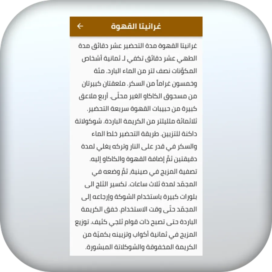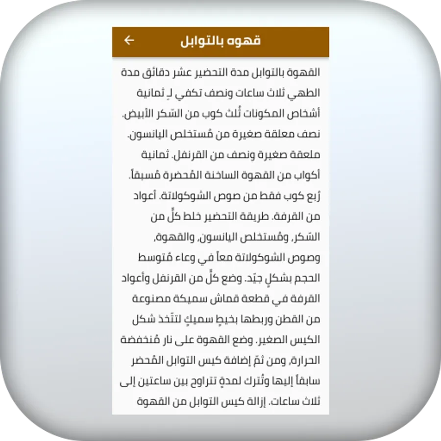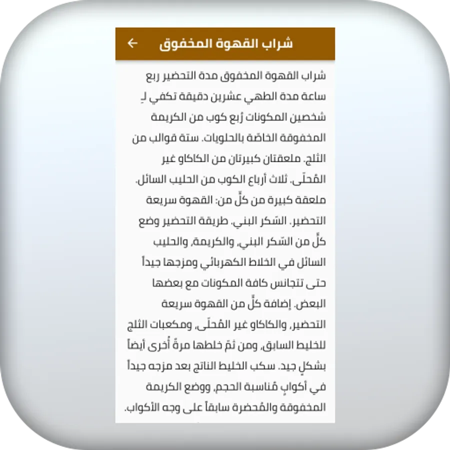 A book and coffee application where the best and most famous types of coffee are prepared, as preparing a wonderful cup of coffee while reading a wonderful book will change a lot in your life as it changed a lot in the lives of others. With spices, the method of preparing a whipped coffee drink, and the method of making plain Arabic coffee, as well as the book and coffee application contains a method of preparing coffee with avocado, and the method of making and preparing Indonesian coffee with avocado. The coffee is complete from the method of work and preparation to presentation