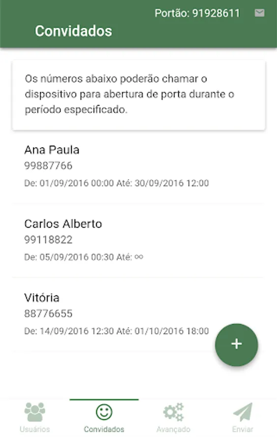 One of the main functions of the product is the guest list, you you can add up to 20 contacts that become users with scheduled time with the permission to open the door. simply making the incoming guests, friends, relatives or employees at events, parties, homes and condominiums.