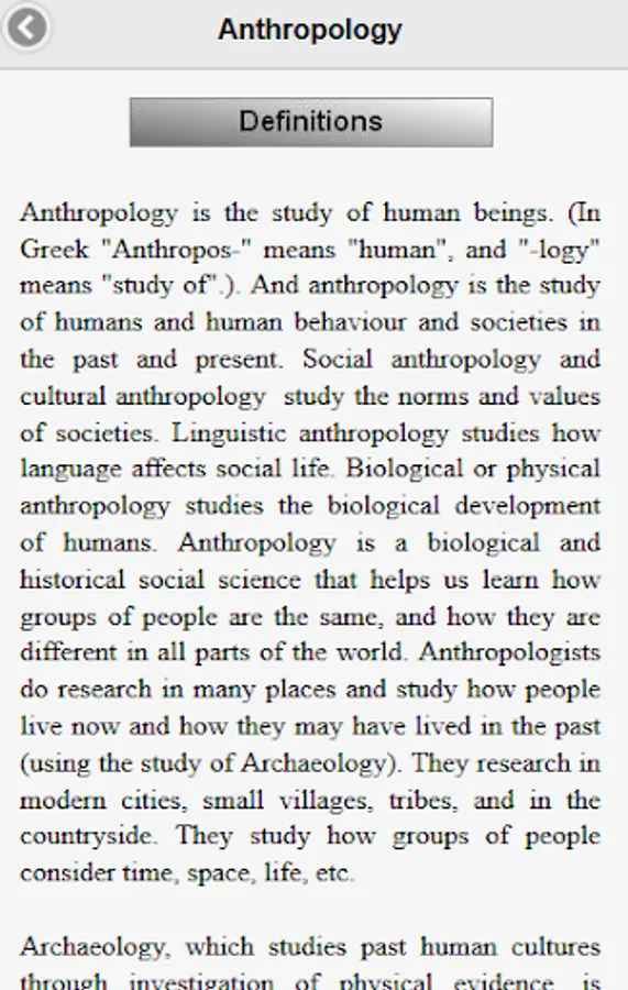Anthropology is the study of human beings. (In Greek "Anthropos-" means "human", and "-logy" means "study of".)And anthropology is the study of humans and human behaviour and societies in the past and present. Social anthropology and cultural anthropology study the norms and values of societies. Linguistic anthropology studies how language affects social life. Biological or physical anthropology studies the biological development of humans. Anthropology is a biological and historical social science that helps us learn how groups of people are the same, and how they are different in all parts of the world. Anthropologists do research in many places and study how people live now and how they may have lived in the past (using the study of Archaeology). They research in modern cities, small villages, tribes, and in the countryside. They study how groups of people consider time, space, life, etc.