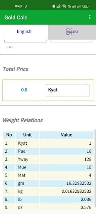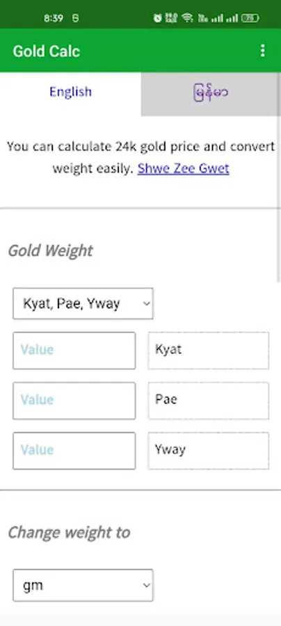 ရွှေဈေးနှင့် အလေးချိန်တို့ကို အလွယ်တကူ ပြောင်းလဲတွက်ချက်နိုင်ပါသည်။ ၁၆ ပဲရည်ရွှေများအတွက် တွက်ချက်ရလွယ်ကူအဆင်ပြေအောင် ဖန်တီးပေးထားပါသည်။