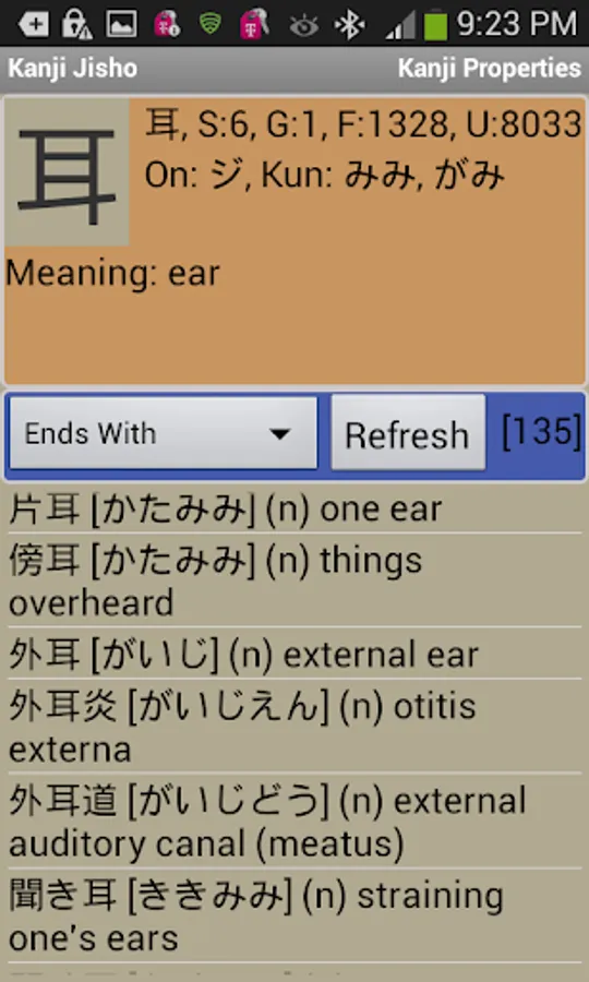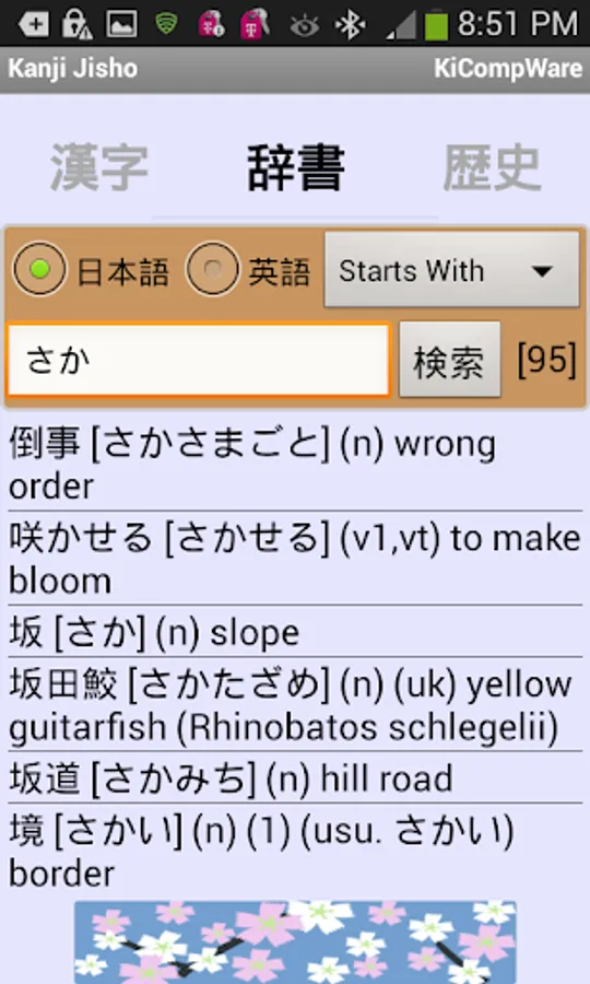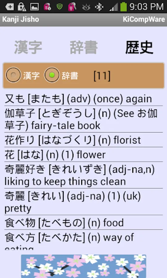 A Japanese kanji and Japanese to English translation dictionary. Search for kanji by stroke, number of strokes, or hiragana. Then display some basic information about the kanji, meaning, all entries in the edict dictionary where that kanji is used (whether first character, last character, or somewhere in between). Lookup Japanese to English translations by kanji, hiragana, katakana, or English. Keeps history of kanji found, or translations found.