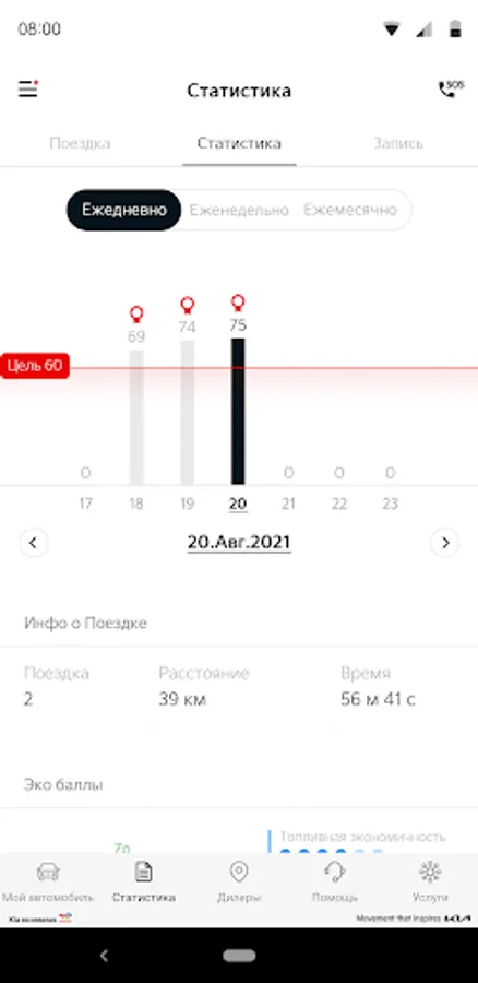Driving history: mileage, speed, fuel consumption, acceleration and braking - taking into account your ECO POINTS