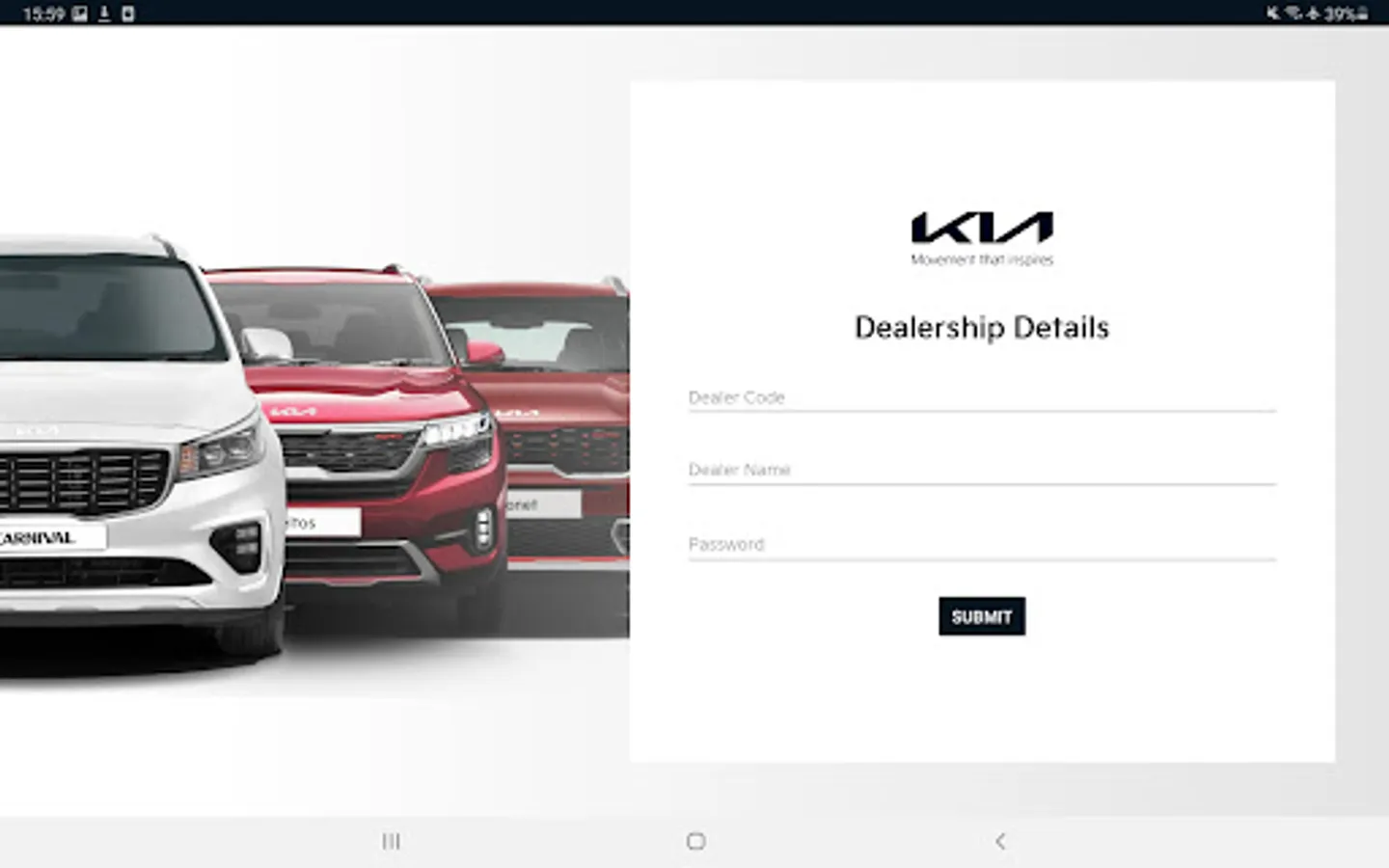 - Search pre-populated KMI Dealer Code in the login screen and give the password that is already shared with you. If you are first time using the App, it will prompt you to change the password.