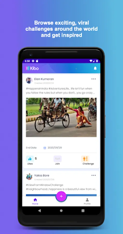 Kibo is a platform for people who love challenges and bring the best out in themselves and others. You can create exciting, fun challenges or join the ones created by others. You can also challenge your friends, family to bring the best for everyone around you. We don’t like to place any restrictions on the kind of challenges people can create with our platform, so let your imagination run beyond limitations. Most importantly, it's FREE. So, come join us to create & spread happiness together.