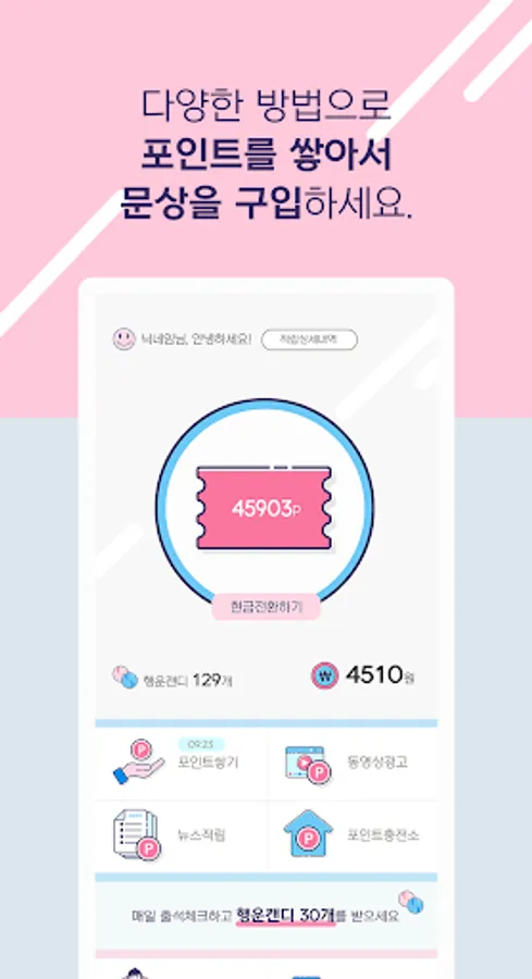 We have applied all the points earning methods that you can do with your mobile phone, from earning using the point accumulation tab button to earning video advertisements and earning news viewing.
