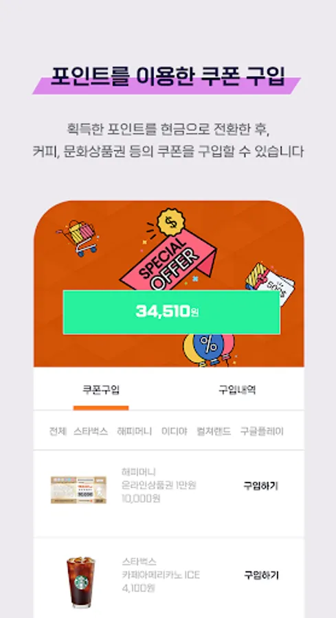 Starbucks, Ediya Coffee, A Twosome Place, Culture Land, Happy Money, Google Gift Code, GS25 Convenience Store Coupons, etc. can be purchased using points accumulated through various coupons.