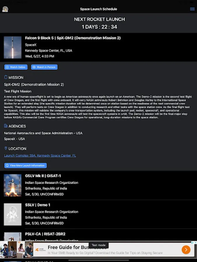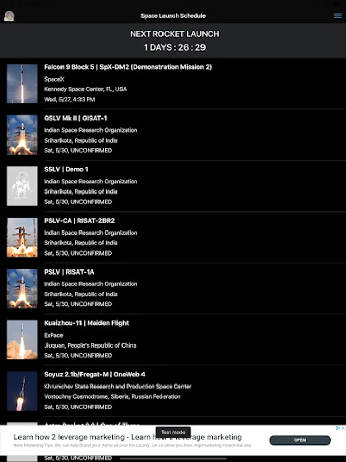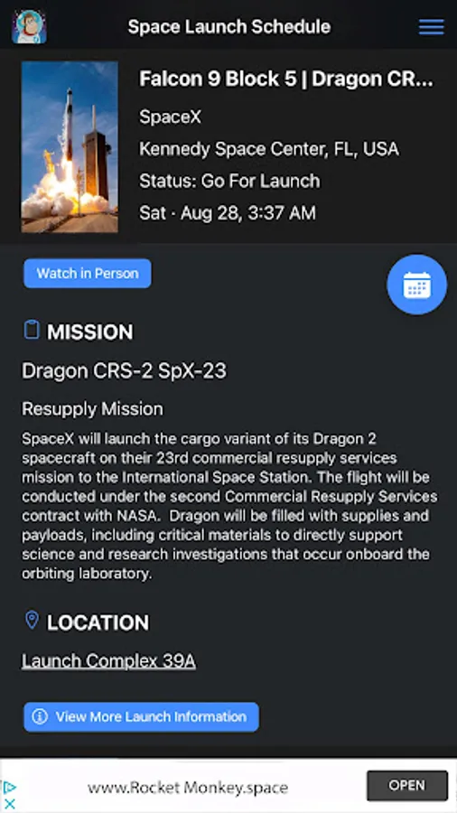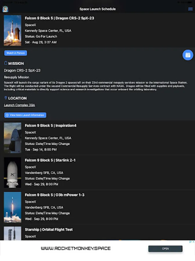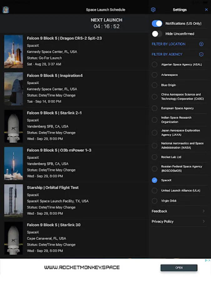 Also known as Rocket Monkey or Space Monkey. Get a list of space rocket launches from launch sites around the world. Customize the Space Launch Schedule app to display only the launch sites and agencies you want to know about. View videos of rocket launches from around the world. Get detailed information about the launch sites, rockets, missions, and space launch companies including SpaceX, ULA, Blue Origin, Rocket Lab, and NASA.