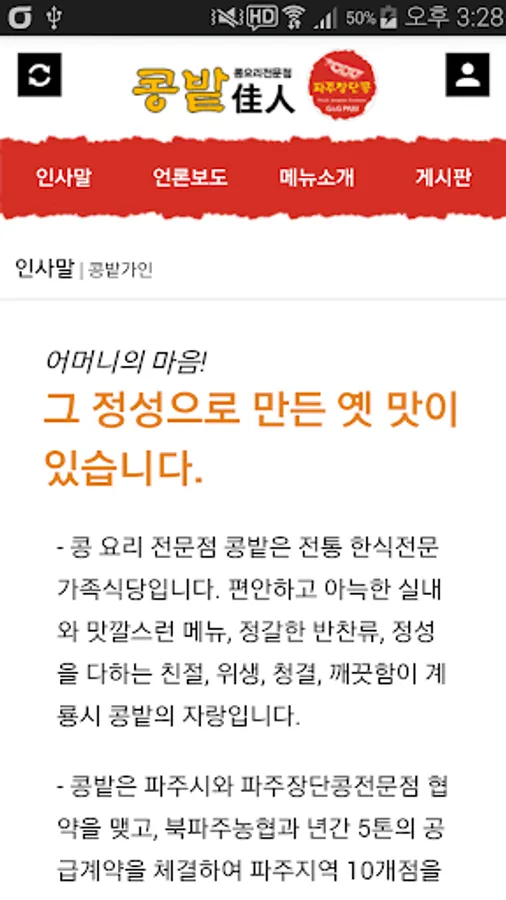- 콩밭은 파주시와 파주장단콩전문점 협약을 맺고, 북파주농협과 년간 5톤의 공급계약을 체결하여 파주지역 10개점을 포함, 전국 11번째로 파주장단콩을 사용합니다.