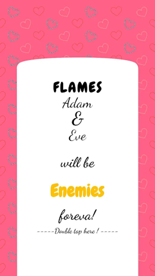 This app is not like any other flames application available, it doesn't give you the result immediately, but after the traversing of "FLAMES" one by one. So you can see each word of "FLAMES" disappear while only one remains. This gives you a nostalgic feeling of waiting for the result just like while playing flames in notebook and striking "FLAMES" letter by letter.