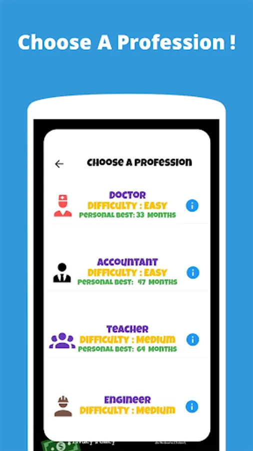 The money game varies for different professions, for doctors it will be a different money game where you have to spend more on education and you will get a higher salary. You can choose the given profession or create your own custom profession.