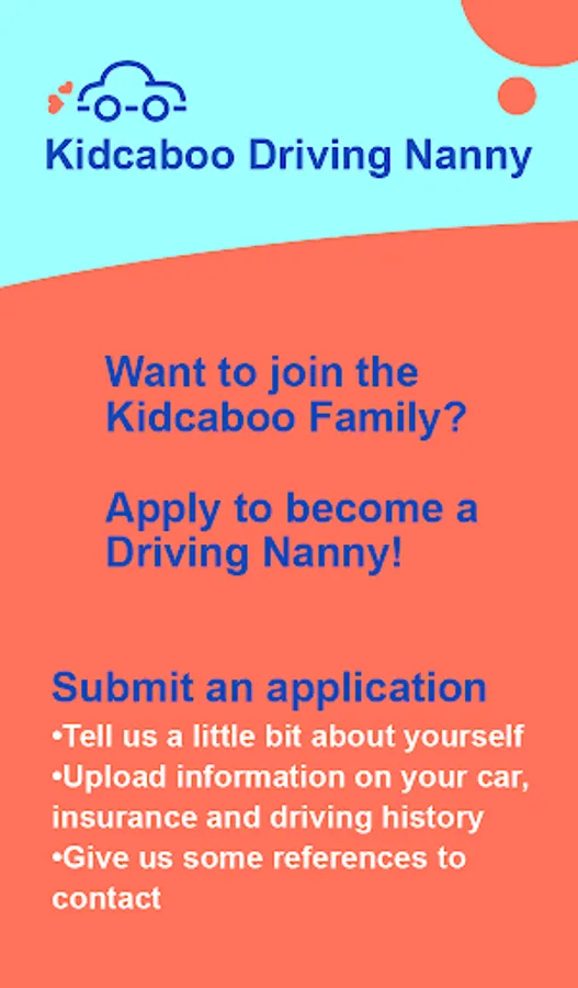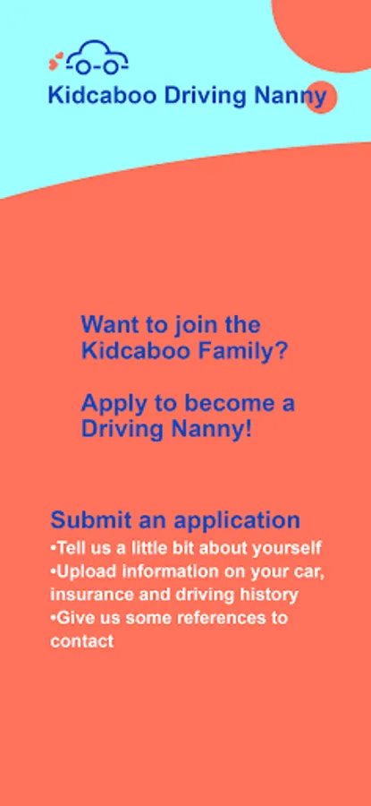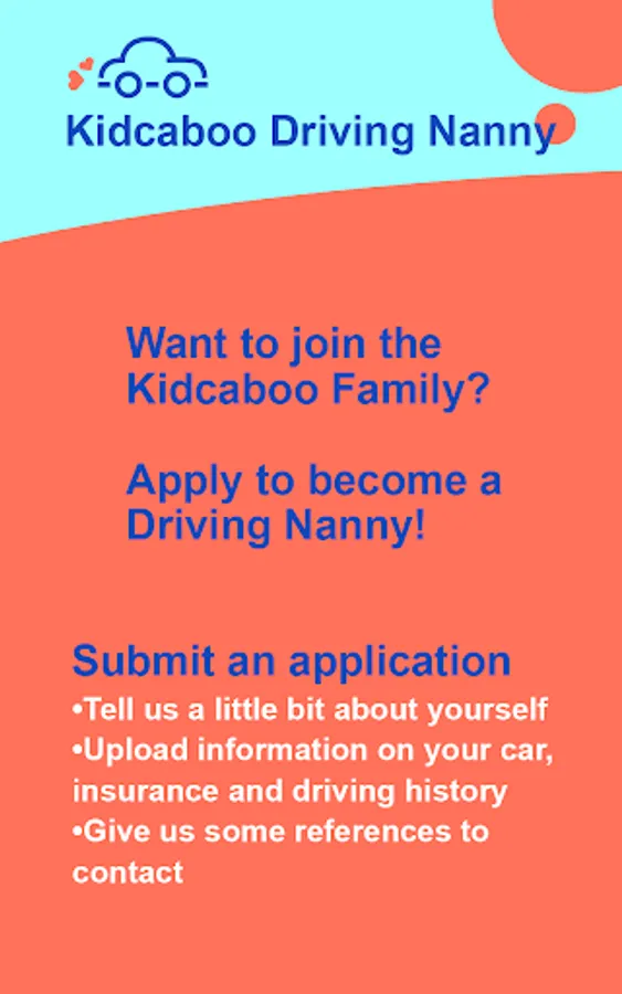 The Kidcaboo Driving Nanny app is your gateway to joining the Kidcaboo family and serving our wonderful family and school clients. Do you want to see if you’re right for Kidcaboo? Just download the Driving Nanny app, create your account and complete the application that will kick things off. Tell us a little bit about yourself, your car and driving record; give us some personal and professional references for our Kidcaboo Recruitment Team to contact and then the interview process begins.