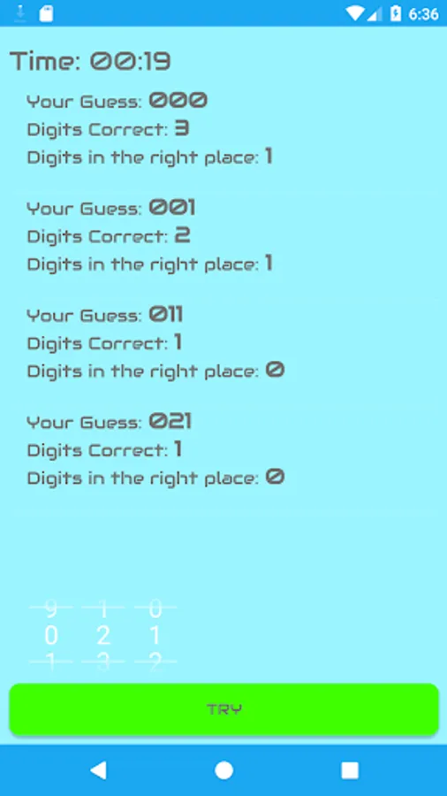 For each guess, the app will tell you how many digits are correct, and how many digits are also in the right position.