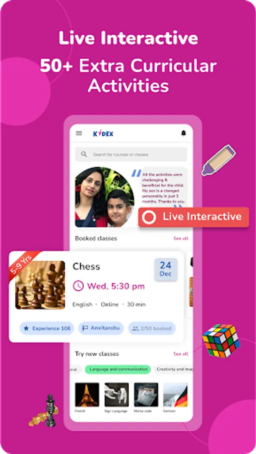 π2) Classes: Get access to daily free classes organized for 30+ extra-curricular activities (Public Speaking, Chess βοΈ, Rubiks Cube , Dance πΊ, Arts π¨, Instruments πΈπΉπΌ, Movie making π¬, Dramatics π, etc.) on the app. Explore multiple activities to help select area of interest. Pursue your interests through paid classes in small batches from some of the best teachers π¨βπ«in the country.
