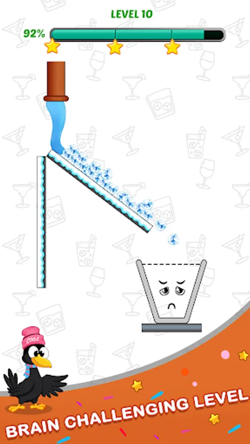 Introducing the newest puzzle game, "Happy Crow," a game that is sure to capture your attention and become your new addiction. The objective of the game is to fill a glass with water and bring a smile to the face of a thirsty crow. Draw a line to create a path for the water to flow into the glass and complete each level by finding the best possible solution.