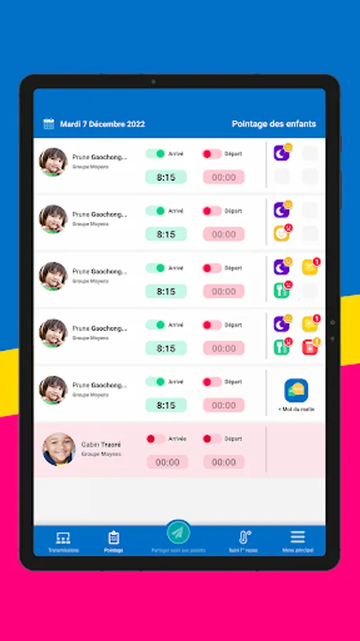 An Excel export allows you to visualize the weekly occupancy rate in order to optimize it. During the check-in you have the possibility to add the "morning word" according to the parent's remarks.