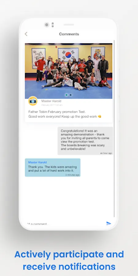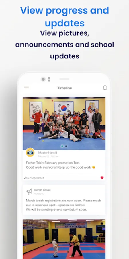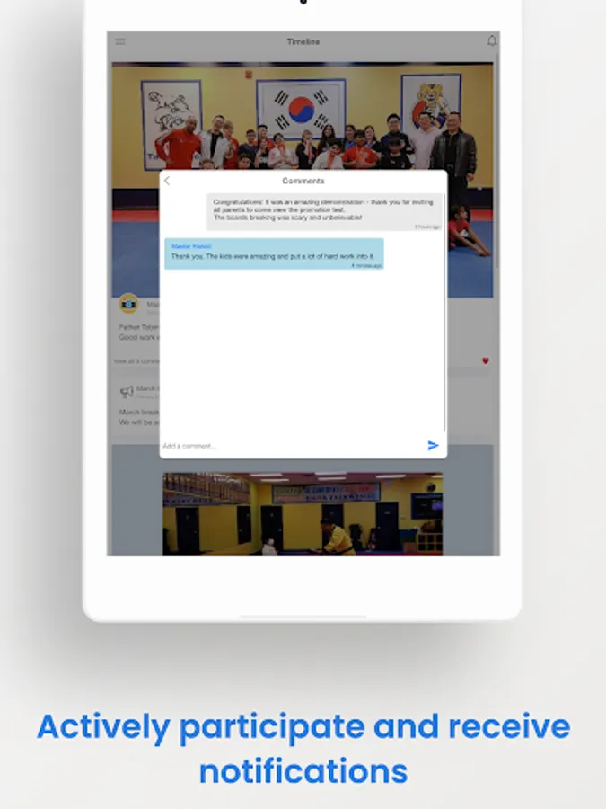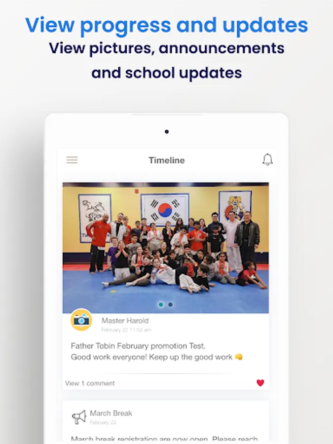 Master Park Tiger Taekwondo app is a secure platform to foster better communication with parents giving an insight to the progress being made. Parents get instant updates on child's progress activities in the form of pictures, observations and reminders.