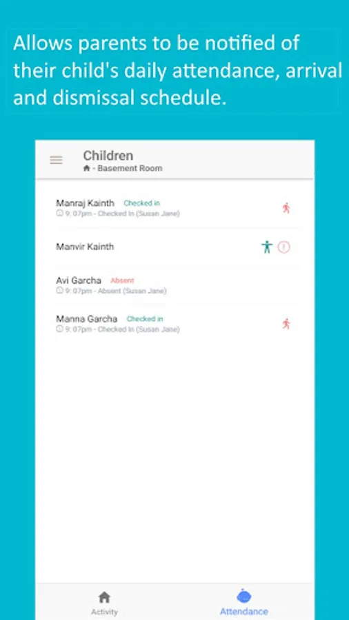 Track child attendance by a check-in/check-out or absence/presence mode. Instant attendance notifications are sent to parents via SMS or mobile push.