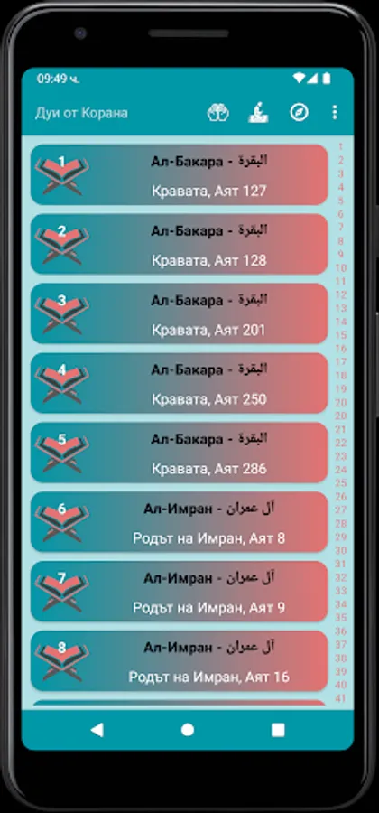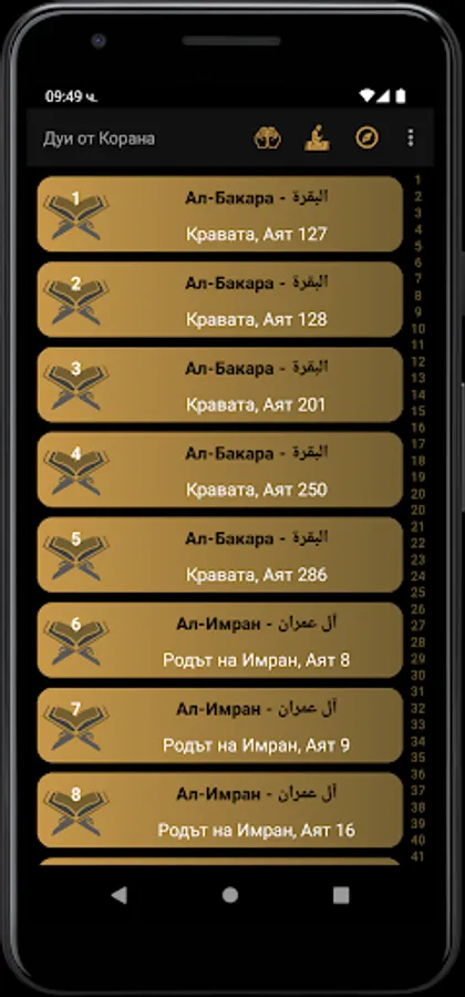 Кратки Дуи от Корана с аудио, синхронизиран текст на Арабски, Транскрипция и Български превод. Дуа и Зикр. Времена за намаз за градове в България. Компас за показване на посоката, в която се намира Кеабето.