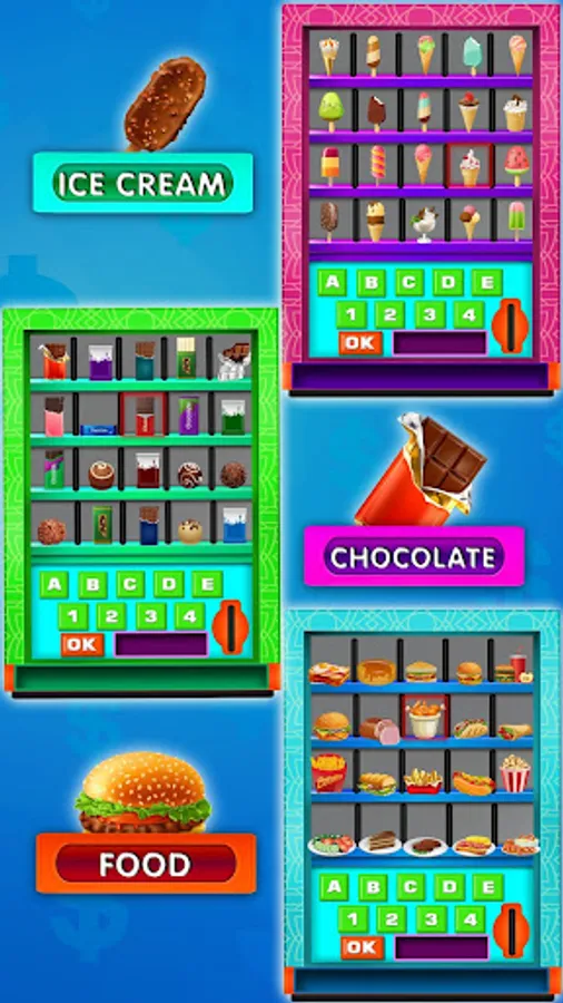 Little boys and girls first learn to use vending machine simulator. Virtual vending machines are mostly place in shopping mall and in stores. Enter money note in the machine and choose the food items or snacks placed in it. Enter the item code mentioned on the machine and that item will fall in the bucket. In this real vending machine game you will have multiple food machines like snacks, chocolate candy bar, ice cream bar and drinks vending machines. Pretend play the whole game play to learn the real life machine working.