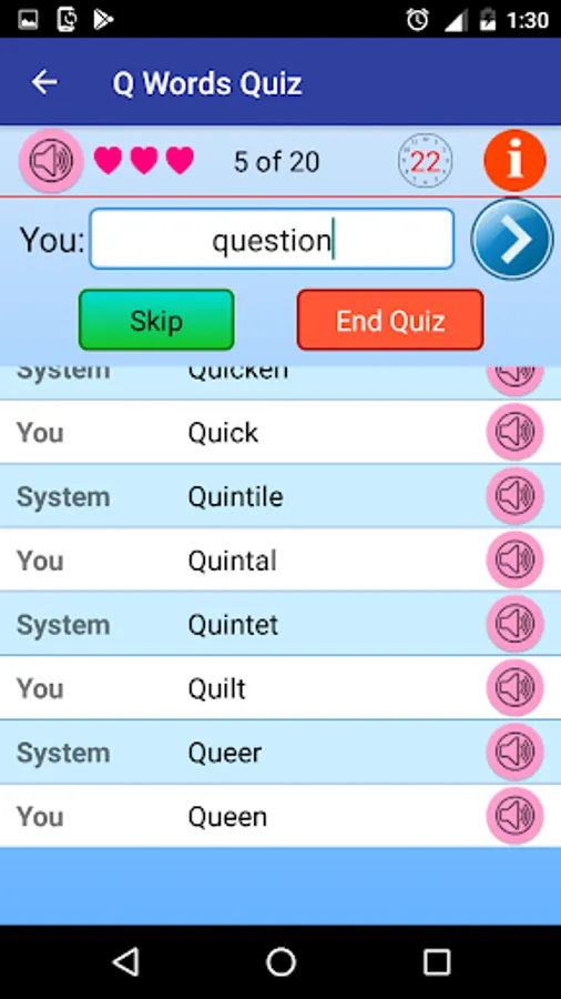 3. After your turn, the system will have a turn, system will select and display a word starting with same letter.