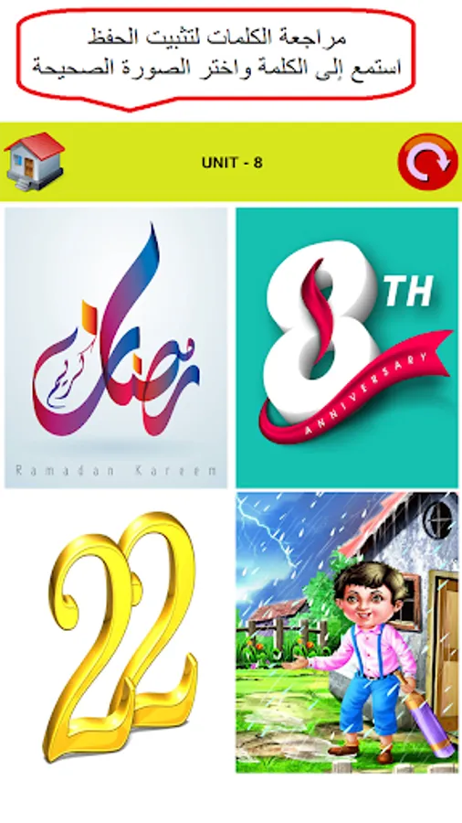 4. Part IV: a review of words the end of each lesson by listening to the word and choose the correct image to install and confirm the conservation process.