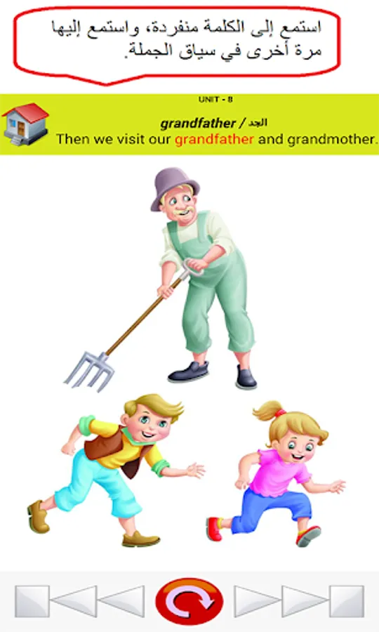 3. The third part deals with the important words for each stage with the status of each word in the phrase useful audio and video, in addition to the meaning of the word in Arabic.