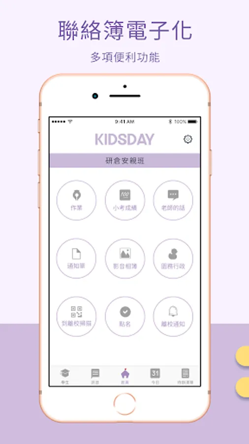 KIDSDAY CLASS雙向溝通電子聯絡簿,特別設置了作業、評量完成與否的提醒,及小考成績的登錄,以及明日攜帶物品提醒的單元。