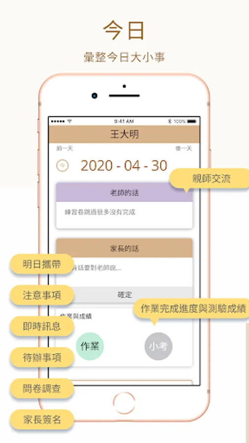 8. 訊息:提供校方發送即時訊息通知學生家長。