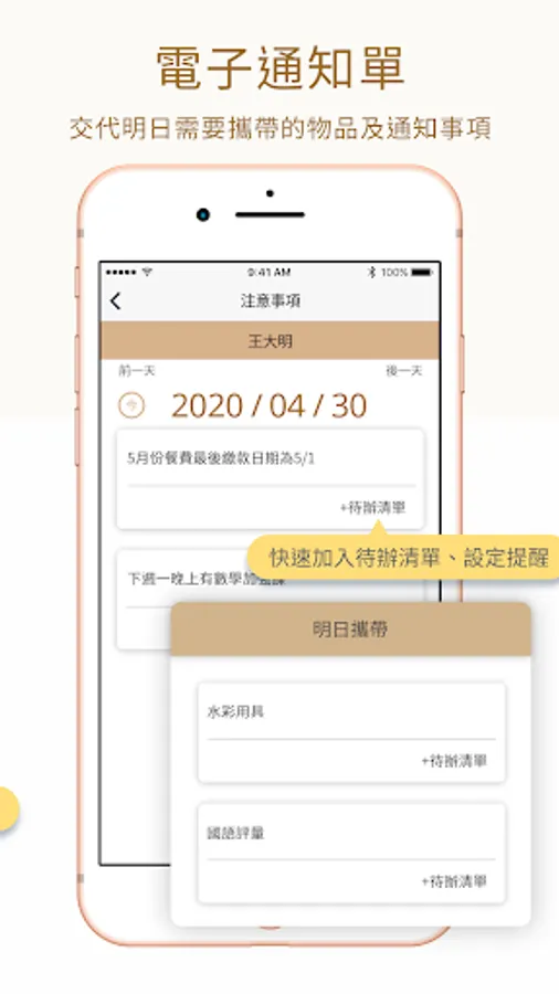 2. 通知單:查閱校方填寫學生的明日應攜帶物品、注意事項
