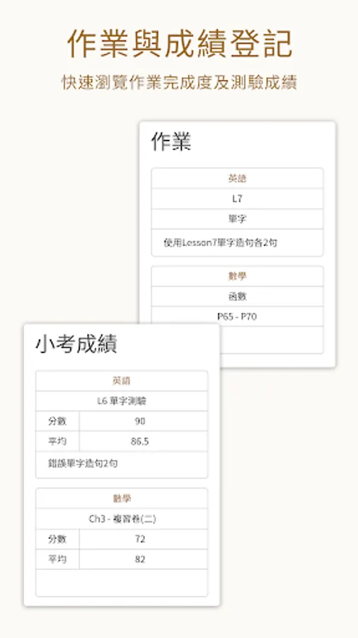 KIDSDAY CLASS家長版雙向溝通電子聯絡簿,特別設置了作業及小考成績的結果,以及明日攜帶物品提醒的單元。
