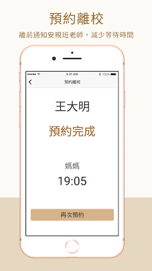 7. 離校通知:家長可以在接孩子下課時提前按下預約鍵,減少等候時間。
