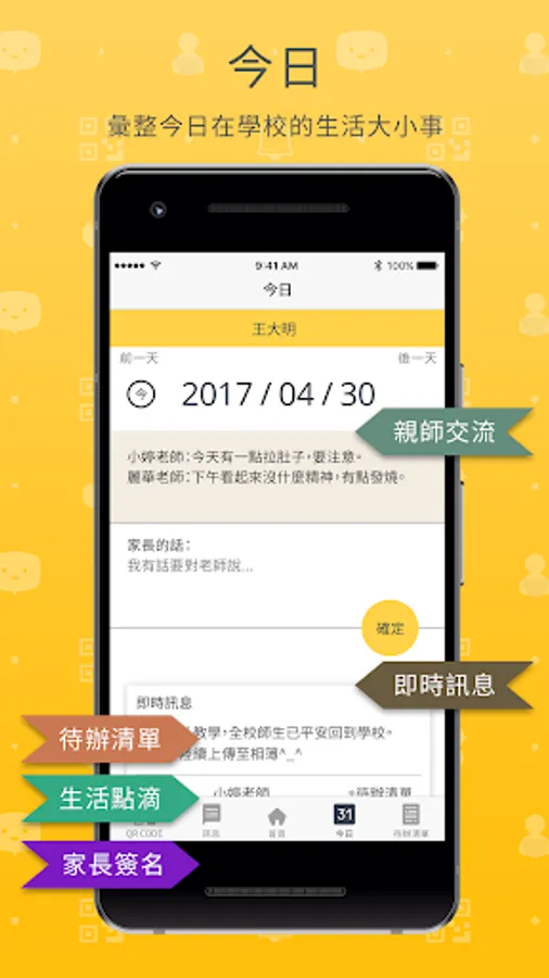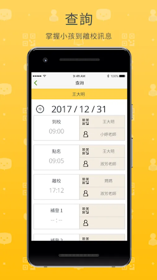入出校管理與點名:幼兒的到校及離校,透過掃描資料條碼,記錄到校及離校的時間,以及接送家長及負責的老師。並自動推播通知主要聯繫的家長。