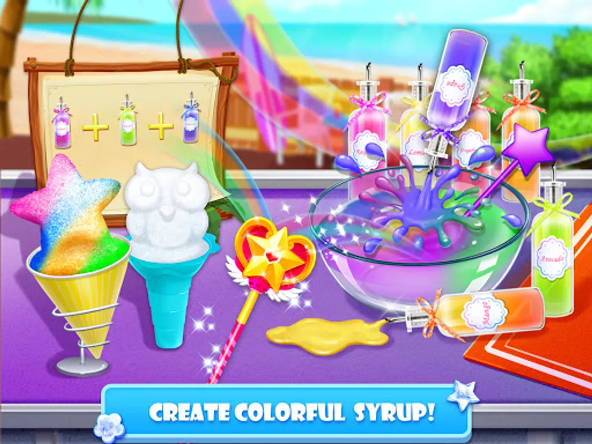 Now, get to the most wonderful step. Add your favorite snow cone flavors. You won't believe that you can make your own rainbow flavors. Just need to mix the flavors together, the magic flavor will be ready. Amazing...