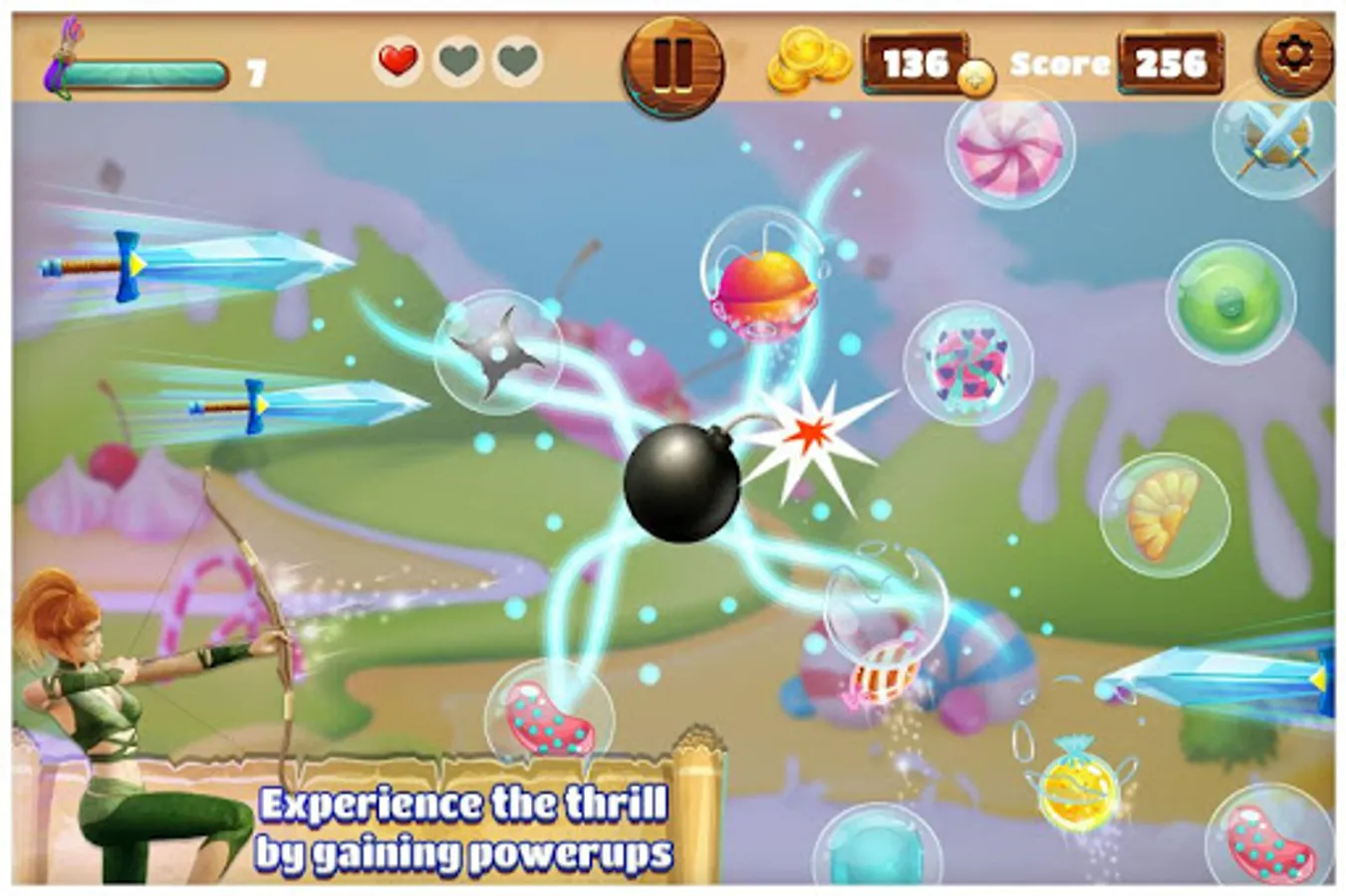 Bow and arrow game is super easy to play. No need to get in a hassle as the game provides only one hand to play with. You just have to set your angle of the bow and start shooting crazy candies and bonuses.