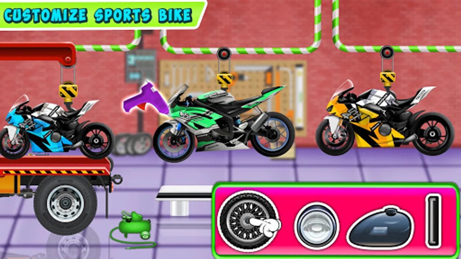 - Variety of motorcycle assemble & repair customization options in motorbike builder factory!